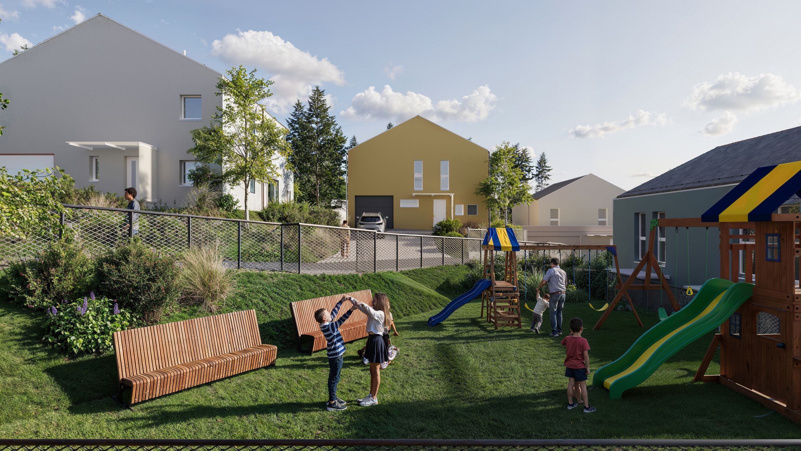 Pensé pour la qualité de vie, le projet « Sur la Cluse » s’organise autour d’une route privée qui dessert chaque villa et mène à un espace commun de jeux et de détente, idéal pour les familles. La priorité donnée aux piétons renforce l’esprit convivial et sécurisé du quartier.